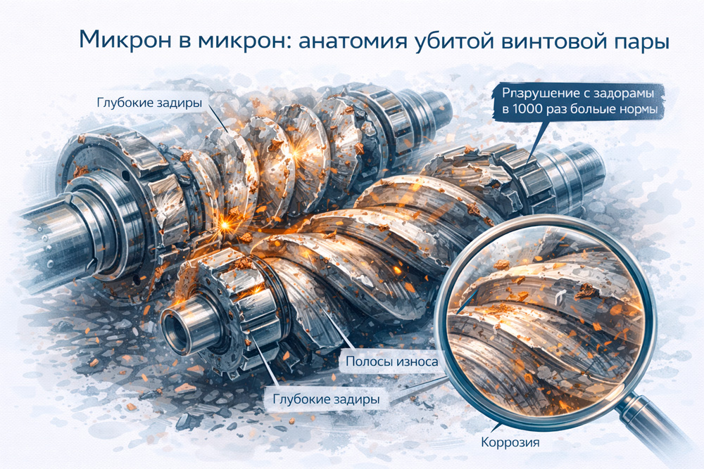 Есть ситуации, когда восстановление винтового блока — это просто выбрасывание денег. Если роторы имели контакт с корпусом по всей длине, и глубина рисок превышает 0.3-0.5 мм, шлифовка уберет слишком много металла. Ты получишь «худые» роторы, которые будут болтаться в корпусе, и никакой масляный клин не спасет. Производительность упадет ниже плинтуса.