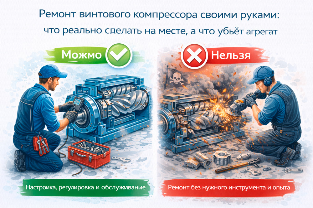 Итоговый вопрос: вы чините, чтобы работало, или чините, чтобы не купить новое? Если второе — пересмотрите подход. Профессиональный ремонт винтового компрессора стоит дорого, но дешевле нового. Самодеятельность в красной зоне стоит нового компрессора. Счёт прост.